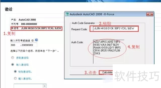 15、 打开软件包里的注册机。16把申请号复制到注册机里面,然后点击【calculate】后复制激活码提示:复制粘贴的时候只能用快捷键“CTRL+C"和"CTRL+V"