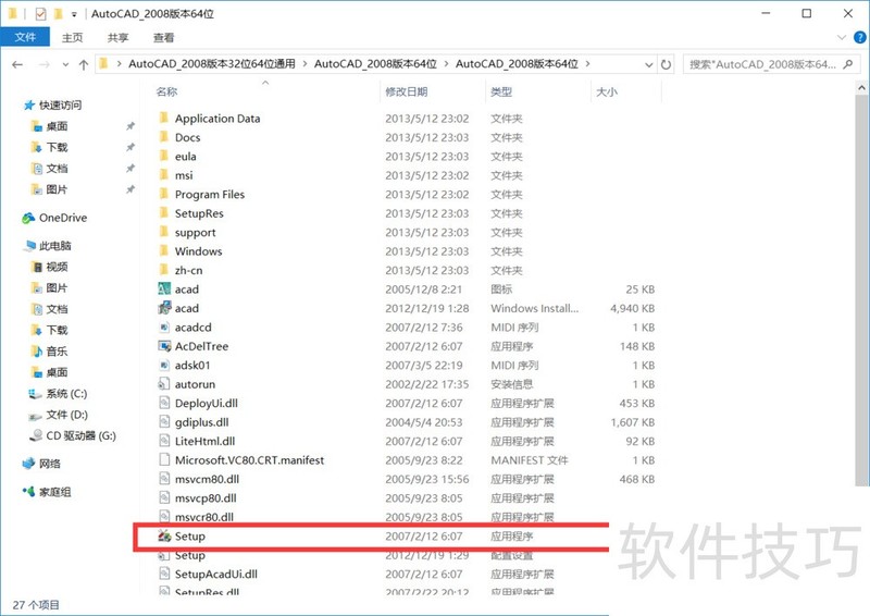 3、 找到【AutoCAD_2008版本64位】目录下的的【setup】双击说明:这个包32位和64位系统通用巨诸激