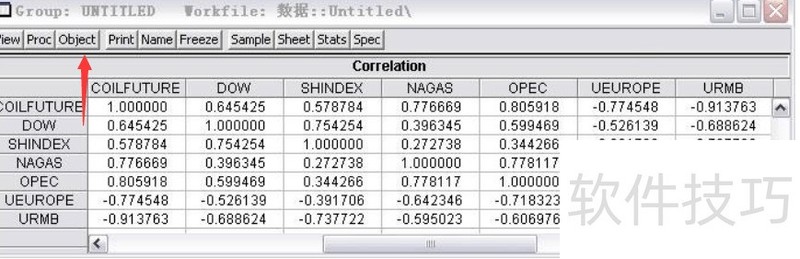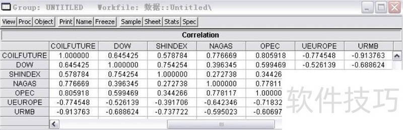 3、 第三步,如图所示,在窗口中输入“cor?coilfuture?dow?shindex?nagas?opec?ueurope?urmb,”分析变量关系。