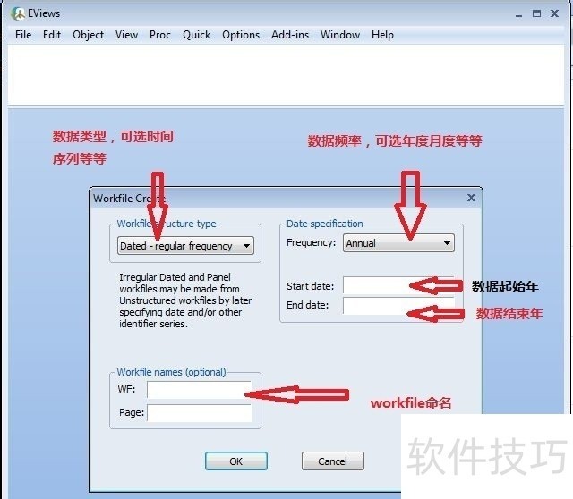 2、 数据结构是常规时间序列,无需改动。时间频率为年度,无需改动。start date输入数据起始年份(本例中为1980).end date 输入数据结束年份(本例中为2010).命名处可随意填写,自己可分辨就可以。点击确定(OK)。