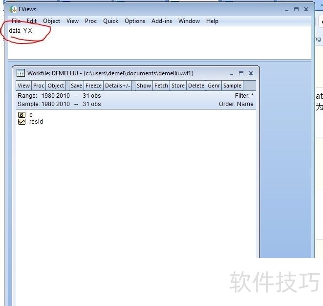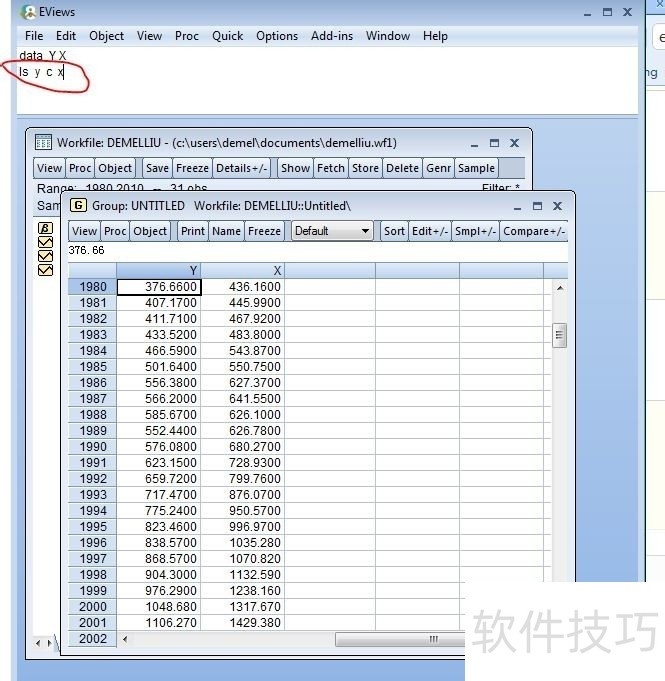 5、 以最小二乘法分析。在主窗口输入“ls y c x”回车。