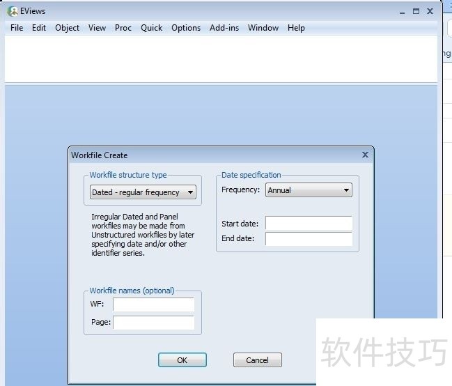 1、 打开eviews软件,创建一个workfile。点击file--new--workfile,即可