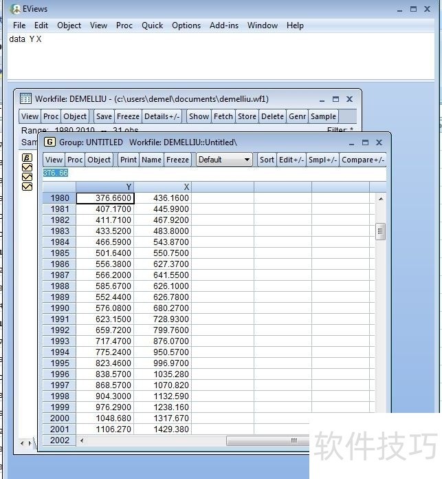 3、 在出现的表格中,在主窗口输入“data Y X”注意,data与Y与X之间需要空格来区分不同变量。输入完成后直接回车。
