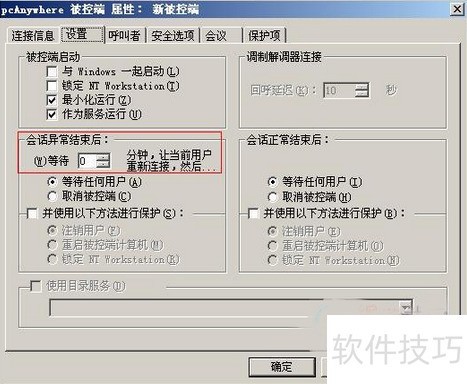 3、 在“设置”选项卡里,需要注意的是“会话异常结束后”这个选项卡,如果选择默认的“等待0分钟后,让当前用户重新连接”,就会让被控端一直等待,可填写1分钟