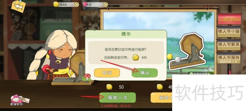 2、 每天有几次免费抽奖机会,免费抽完后可以花50个金贝壳抽一次,点击【确认】按钮。