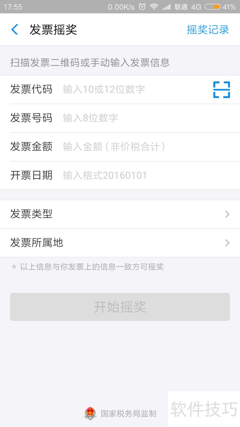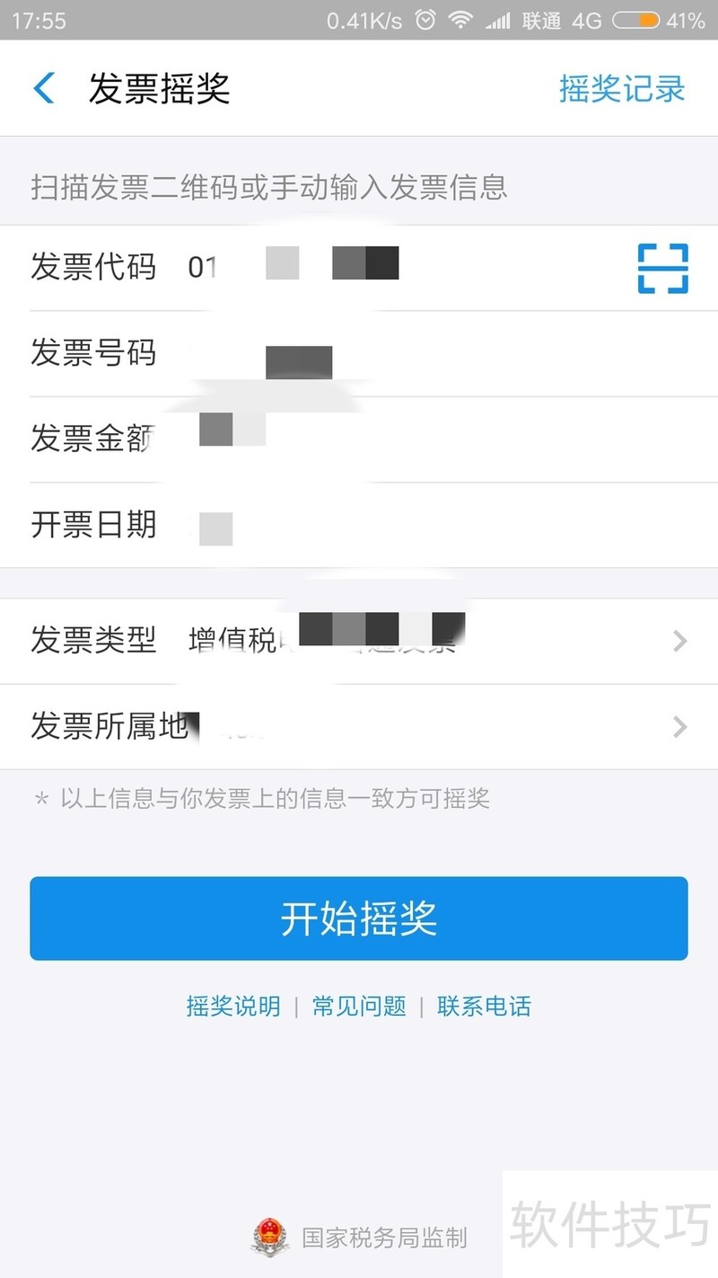3、 在发票摇奖哪里。进行扫描发票二维码,或者手工输入发票信息,扫完之后发票信息自动带出,如图所示。