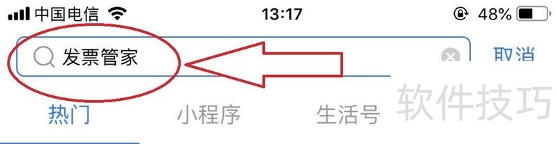 2、 在支付宝首页搜索框中输入:“发票管家。”,点击确定。