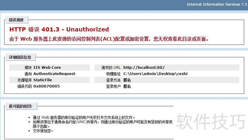 5、 浏览后报错,这个错误说明网站没有权限,加上IUSR权限就可以了
