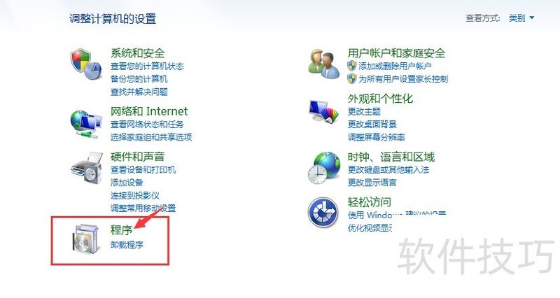 3、 在<控制面板>主页找到并点击<程序>功能,进入到程序管理页面;