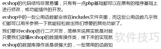 2、 ecshop的代码结构非常易懂,只有有一点php基础都可以在原有的程序基础上进行修改,或功能插件的开发。ecshop中的一些公用函数都会放在includes文件夹里,而这些公用函数几乎我们都可以用来参照一下败袭就能轻松做出我们想要的其他功能了。我们要对ecshop进行二次开发,简单来说其实就是对数据库的读写操作,所以只要我们读懂ecshop的数据库操作类,接下来的实现就很轻松了。ecshop的数据库操作类是很强大的,一些常用的函数如下: