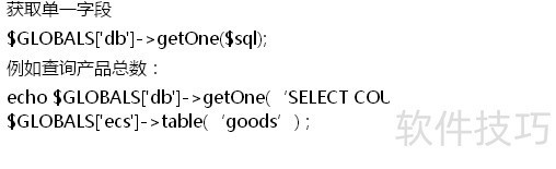 3、 获取单条记录$GLOBALS["db"]->getRow($sql);4获取单一字段$GLOBALS["db"]->getOne($sql);例如查询产品总数:echo $GLOBALS["db"]->getOne(‘SELECT COUNT(*) FROM ‘ . $GLOBALS["ecs"]->table(‘goods’) ;