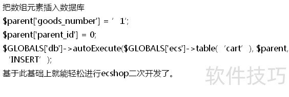 5、 获取所有记录$GLOBALS["db"]->getAll($sql);6执行sql语句$GLOBALS["db"]->query($sql);7把数组元素插入数据库$parent["goods_number"] = ’1′;$parent["parent_id"] = 0;$GLOBALS["db"]->autoExecute($GLOBALS["ecs"]->table(‘cart’), $parent, ‘INSERT’);基于此基础上就能轻松进行ecshop二次开发了。