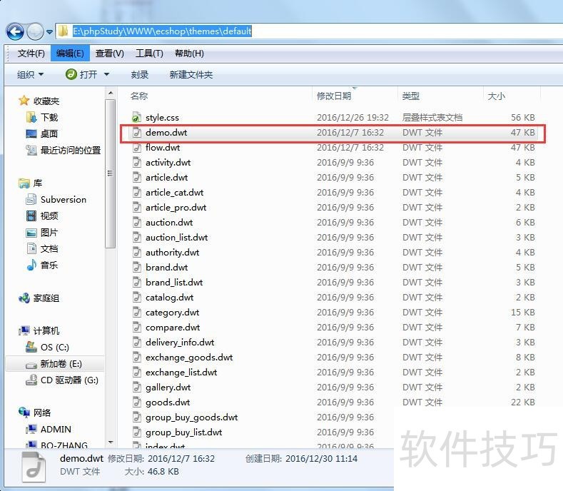5、 然后,在themes/default文件夹下新建demo.dwt模板文件;