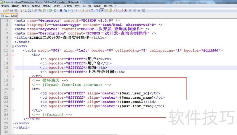 3、 执行SQL查询;结果如下:4将查询结果展示到模板;将查询结果$res,赋值给模板;然后指定展示的模板;备注:比如展示的模板为demo.dwt;