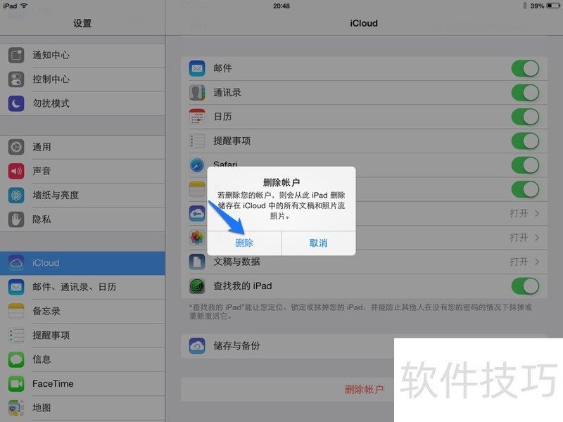 4、 然后系统提示若删除 iCloud 账户,会从当前设备删除所有储存的文稿数据和照片流。由于个人文稿和照片流涉及个人隐私,所以会强行删除这些资料。点击“删除”按钮继续,如图所