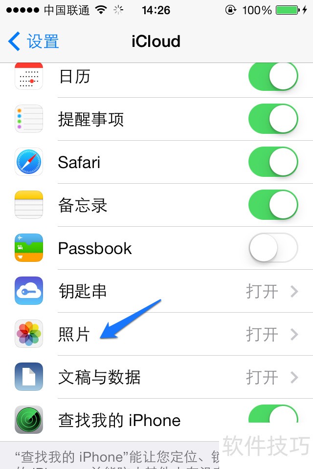 4、 在 iCloud 设置列表中,找到“照片”选项,点击打开,如图所示