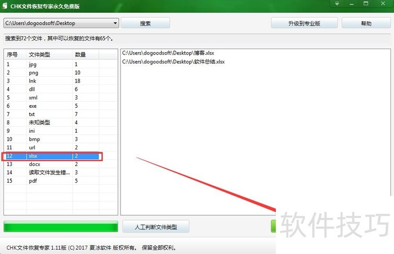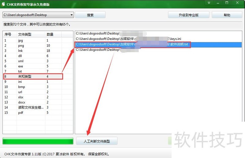 4、 如果文件类型显示“未知类型或TXT文件”:1)TXT文件。在软件左侧选择“未知类型或TXT文件”,在右侧文件列表中选择一个文件,点击【人工判断文件类型】。
