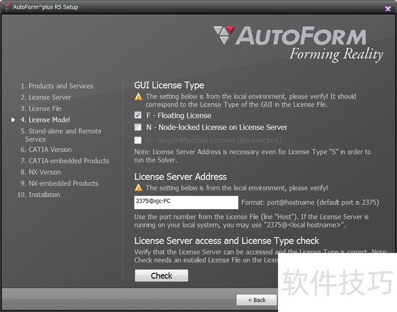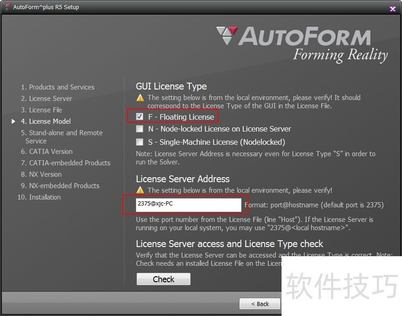 10、 在“F-Floating License”前打钩,在对话框里填写“2375@计算机名”,下一步