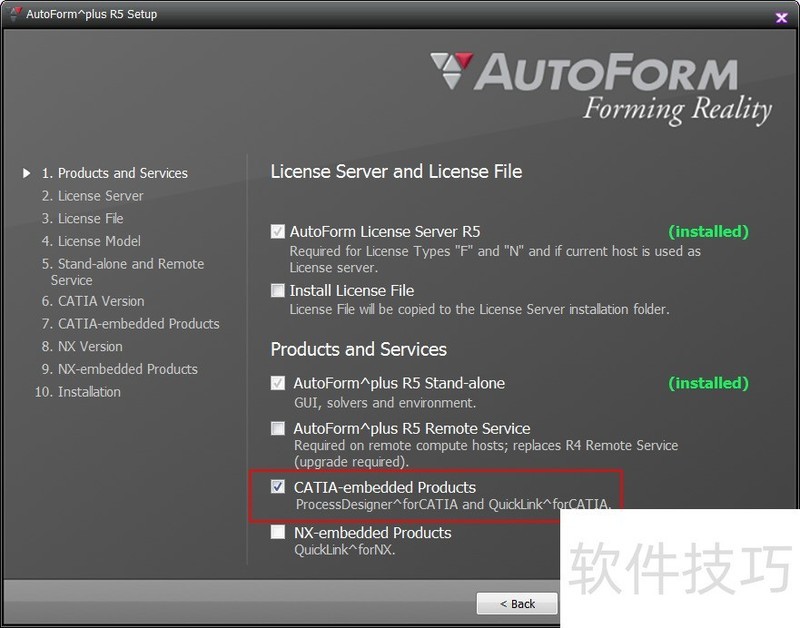 13、 安装CATIAUG插件安装CATIA插件(仅支持CATIA R18-R22)重复步骤1、2,选择“CATIA-embedded Products ”,点击下一步进行安装,
