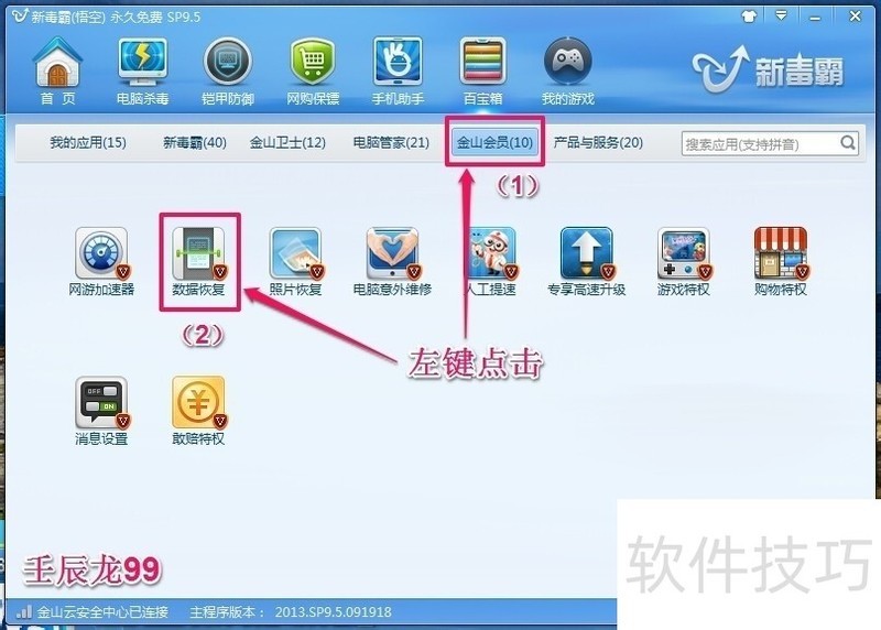 2、 在毒霸的百宝箱窗口,我们左键点击:(1)金山会员,(2)数据恢复;