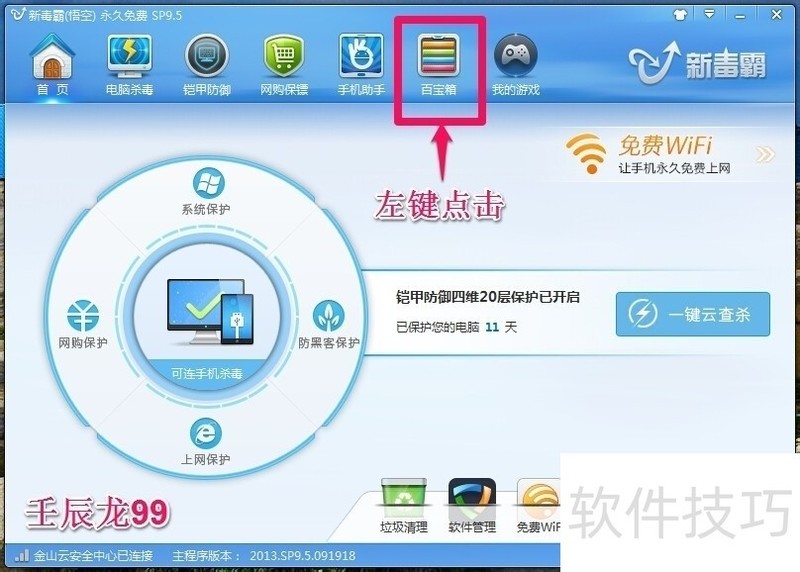 1、 金山数据恢复的使用方法步骤:我们左键点击金山毒霸图标(右下角),启动金山毒霸,在打开的金山毒霸窗口,再点击:百宝箱;