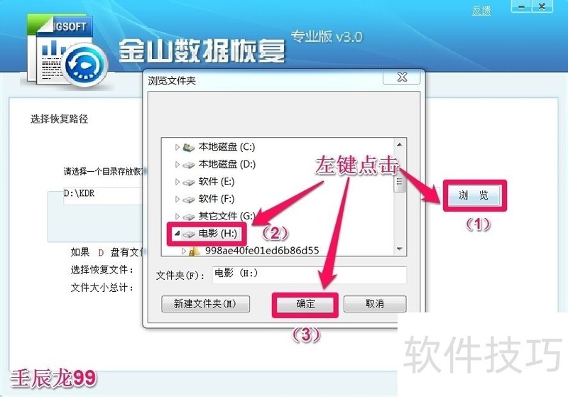 7、 这时,恢复数据程序要求我们选择恢复路径,即把恢复后的文件保存到计算机的哪个磁盘,我们按照图示的操作,(1)点击:浏览,(2)在打开的浏览文件夹窗口,选择把恢复后的文件保存到H:/磁盘,(3)点击:确定;