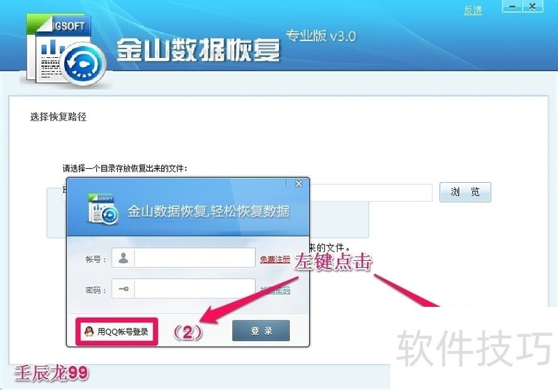 8、 作好上述工作后,我们左键点击:开始恢复(1),这时会弹出一个登录方式的窗口,我们可以选择用QQ帐号登录(2);