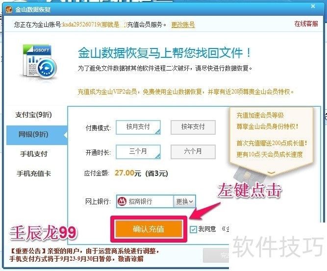 12、 因为这是一个收费软件,我们要充值以后才能进行数据恢复,朋友因为资料重要,只好按月充值支付了三个月的费用27.0元,点击了:确认充值;