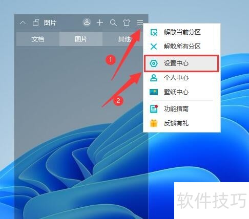 2、 进入主界面后,点击右上角“菜单”按钮(三横线图标),在下拉选项中,点击“设置中心”进入,如图所示。