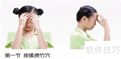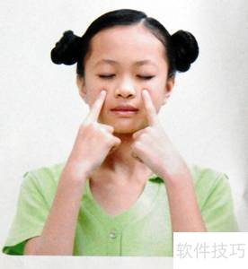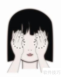 2、 按揉太阳穴,刮上眼眶(眉梢和外眼角的中间向后约3cm凹陷处) ?动作要领:用大拇指罗纹面按揉太阳穴,每按揉一次为一拍,连做四拍,再用双手食指第二节内侧,沿眉弓从眉头到眉梢刮上眼眶,刮上眼眶一次为两拍,连做四拍。 ▲一定要用食指的第二节内侧来刮上眼眶,对穴位的刺激比较适度。 ?