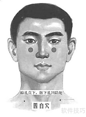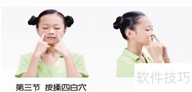 3、 按揉四白穴(眼睛瞳孔中间垂直线和鼻梁中间的横线交叉点上) ?动作要领:用双手食指罗纹面按在四白穴上,每按揉一次为一拍,连做四个八拍。 ▲按揉四白穴时,要固定在穴位处,按揉面不要太大。 ?