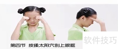 4、 按揉太阳穴 刮上眼眶?用双手大拇指的螺纹面分别按在两侧太阳穴上,其余手指自然放松,弯曲。伴随音乐口令,先用大拇指按揉太阳穴,每拍一圈,揉四圈。然后,大拇指不动,用双手食指的第二个关节内侧,稍加用力从眉头刮至眉梢,两个节拍刮一次,连刮两次。如此交替,做四个八拍。?