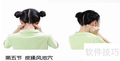 4、 按揉风池穴(后颈部枕骨下,两条大筋外缘陷窝中,与耳垂齐平) ?动作要领:用双手的食指和中指并拢,用两指的罗纹面按揉风池穴,每按揉一次为一拍,连做四个八拍。 ▲找准风池穴,在局部按压时,会有酸胀微痛感。 ?