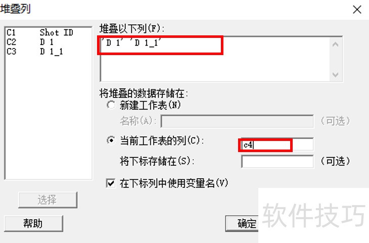 3、 1)按住"shift"键,单击"C2"和"C3"列,再单击”选择“按钮,将再”堆叠以下列“框中将出现选中的列;3.2)将堆叠的结果存储在”当前工作表的列“”C4“;3.3)最后单击”确定“按钮;