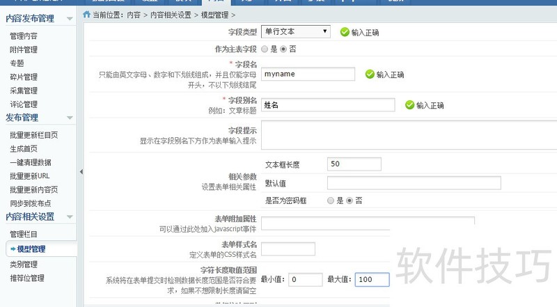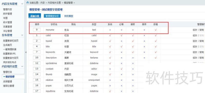 2、 选择添加模型,弹出窗口,按照你的需求填写,这里我写测试模型,点击确定保存3模型添加好了以后,点击字段管理--添加字段4在弹出窗口里添加自己需要的字段名称。输入的类型啊等
