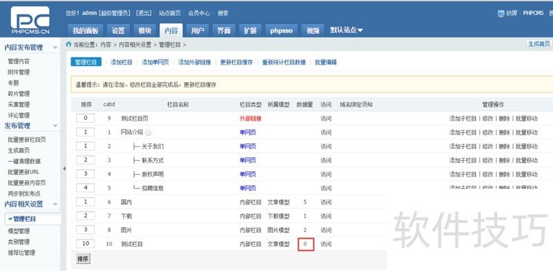 6、 然后开始修改,点击内容--栏目管理,选择要更换模型的栏目,这里注意了,当栏目里数据为0时才可以修改栏目模型,这里我新添加了一个内容模型的栏目
