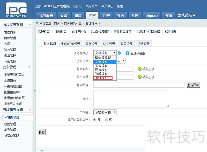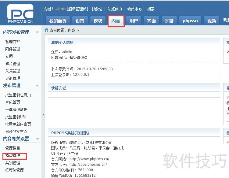 1、 登录PHPCMS后台,选择管理内容(顶部导航)--模型管理(左侧导航最下面)