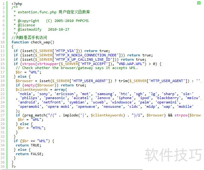 1、 首先在phpcms/libs/functions/extention.func.php里面写入判断手机访问的自定义函数
