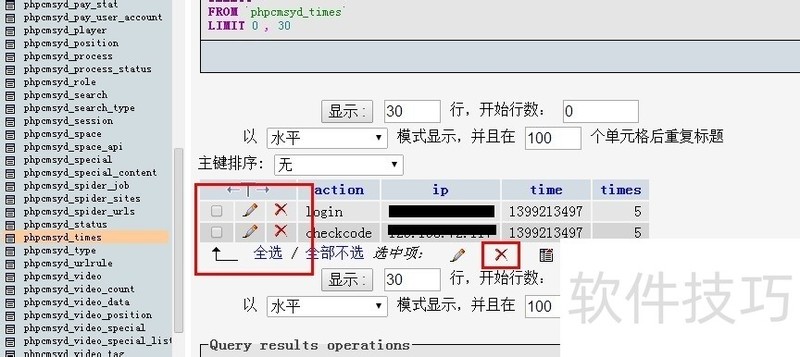 3、 打开你phpcms_times表,前缀可能根据自己的情况有所不同。将你的ip地址对应的项删除掉,如果不能确定你的信息可以直接全选,然后点击删除。这样你就可以直接去登录后台,而不会有ip锁定的提示了。