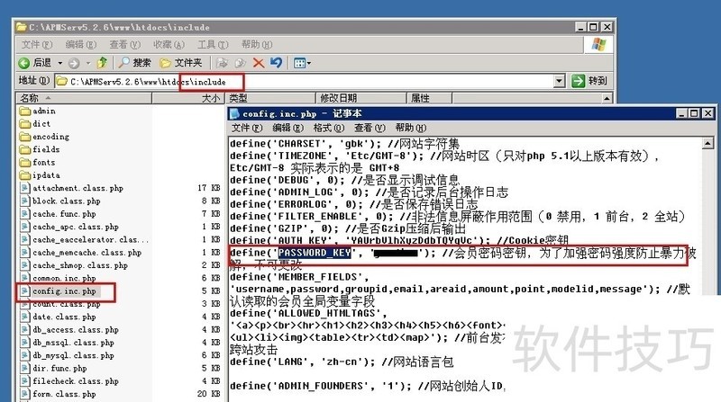 4、 找到你的密码秘钥PASSWORD_KEY在include目录下找到config.inc.php文件,搜索PASSWORD_KEY,找到你设置的这个值,如图所示。