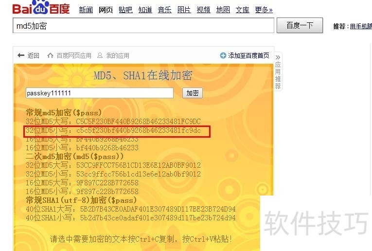 5、 编写程序生成新密码在phpcms中,密码是用 秘钥+密码 然后做八暗md5加密存储的。所以我们只需要编写如下程序即可输出我们的密码加密后的字符串,也可用现有的网页md5加密。示例程序:<?php$str="passkey"."111111";echo md5($str);?>