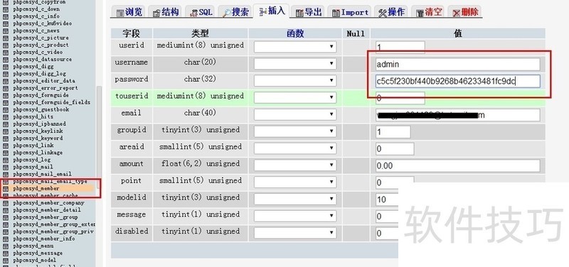 6、 复制加密后的字符串,找到数据库中的phpcms_member表,选择你的用户名,点击编辑,然后将密码字符串替换为复制的加密过的字符串。