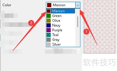 5、 在弹出窗口中,点击“Color”按钮,在弹出栏目中,选择网格使用的颜色,如:点击“Maroon”