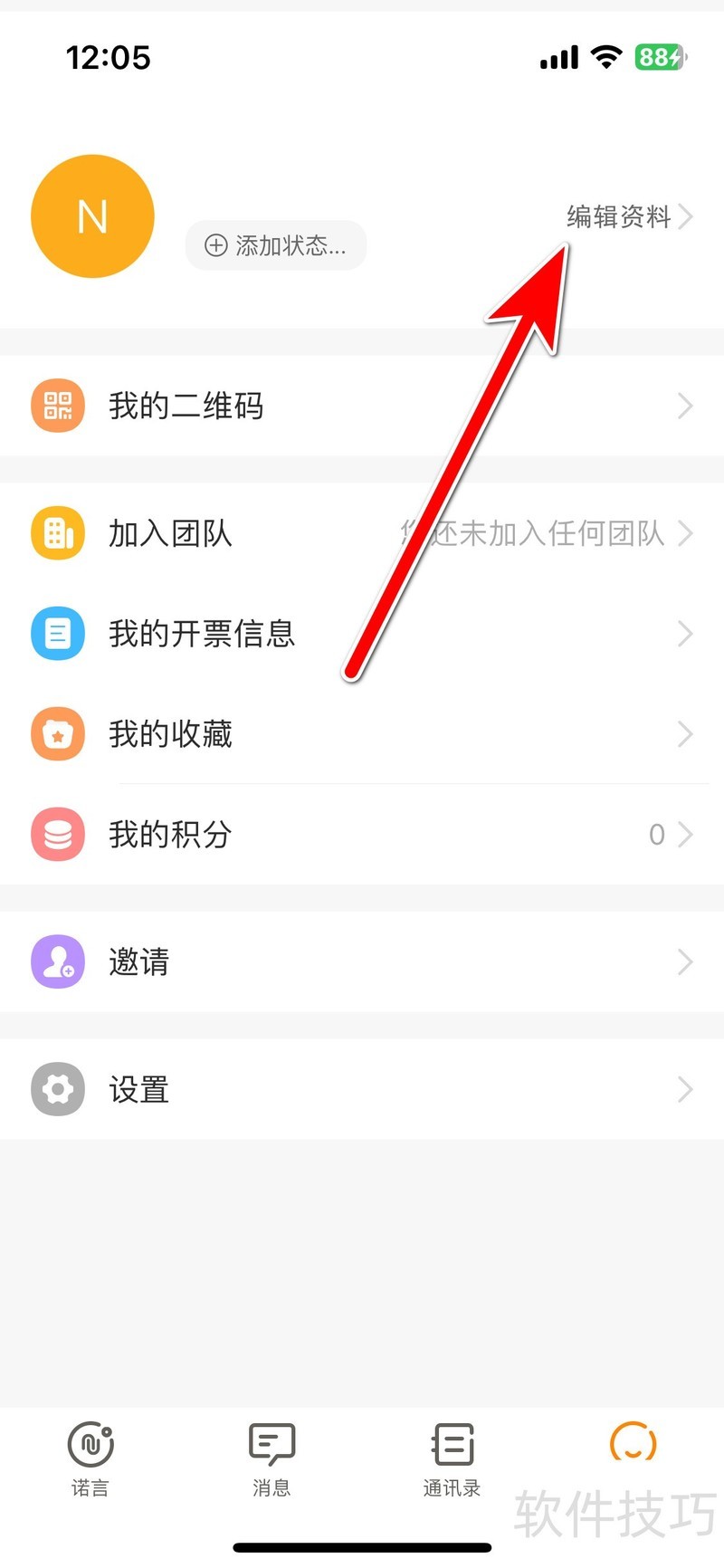 1、 第一步:在手机诺言的首页中,点击【编辑资料】选项。