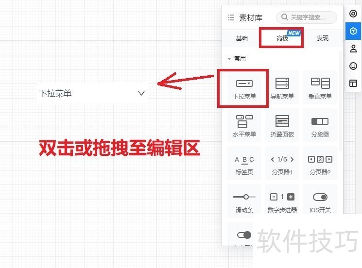1、 放置下拉菜单到编辑区:在素材面板,点击”高级“Tab,双击或拖拽下拉菜单组件至编辑区
