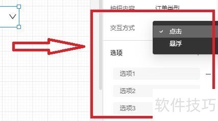 2、 设置下拉菜单选项及交互方式:在右侧的设置面板,可以录入各选项的名称,以及设置下拉菜单的交互方式