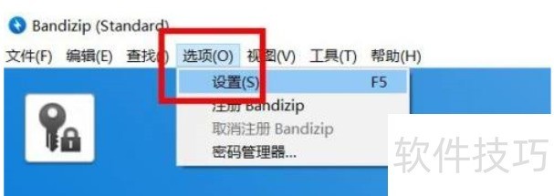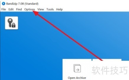 1、 在Bandizip窗口中,点击菜单栏上的“选项”。