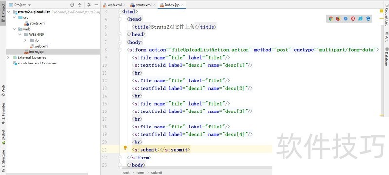 1、 打开IDEA工具,创建一个javaWeb工具,引入struts2相关的jar以及再web.xml中进行配置相关的拦截器。最后再src目录中创建struts2用于管理action的请求?2再index.jsp页面中,创建一个表单域,再该域中添加四个file标签作文多文件上传的file域.?