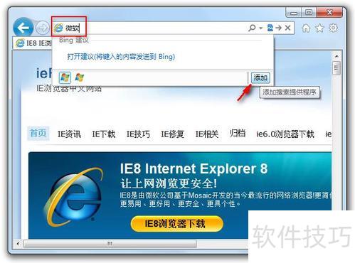 7、 网址即可搜索?你应该会发现IE9跟IE8的不同,就是右上角的搜索栏位不见了。如果要显示搜索引擎的话,只要开个新窗口或分页,然后在网址栏输入要搜索的文字,按下〔Enter〕即可搜索。因为预设只有微软的Bing搜索引擎,因此你在搜索时按下搜索列右边的「添加」,就可以加入其他的搜索引擎了。?