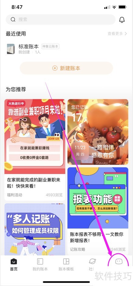 1、 在随手记中找到需要操作的账本,点击记一笔。